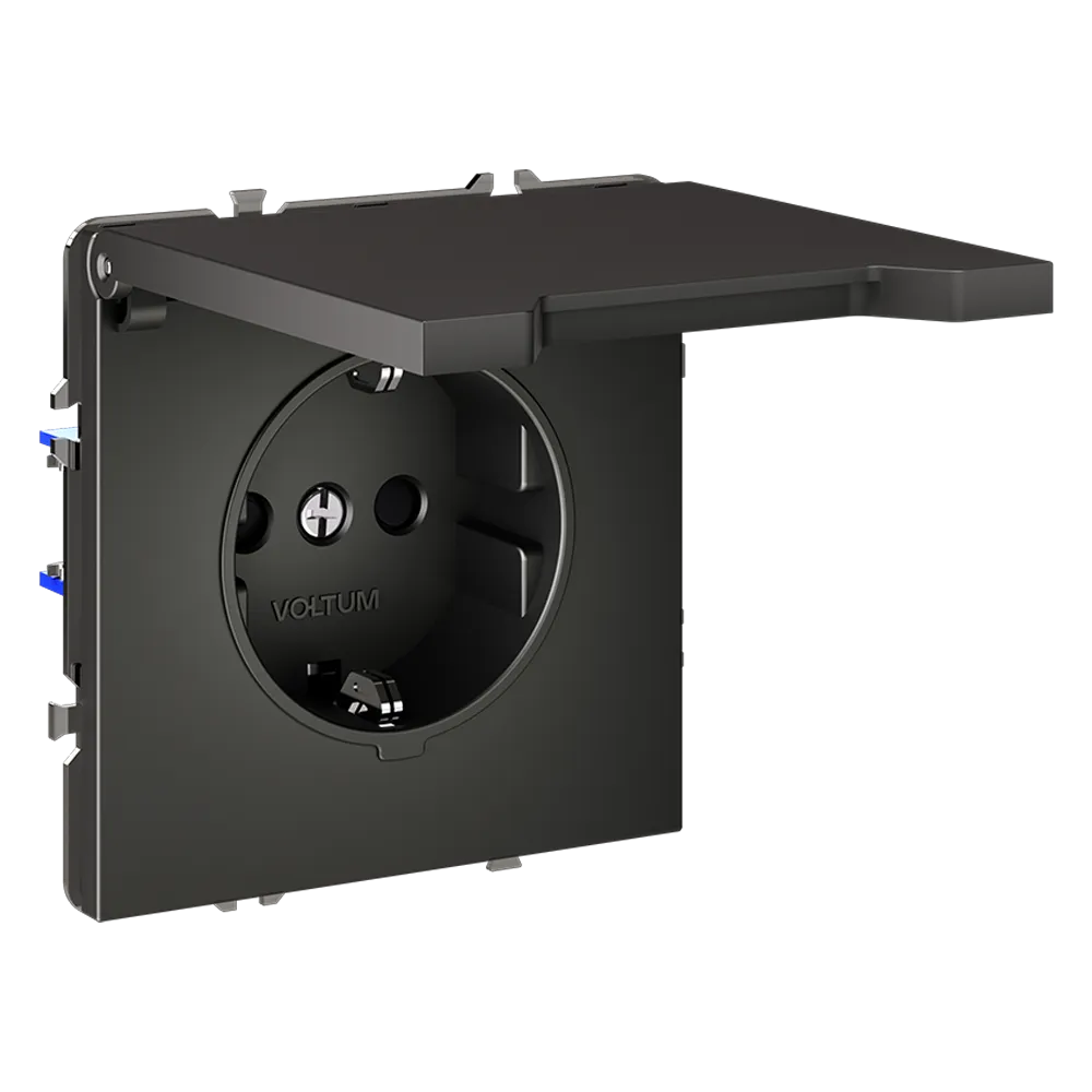 Розетка VOLTUM S70 с заземлением и защитными шторками и откидной крышкой  — это решение максимальной безопасности и эстетики для современного интерьера. Идеально подходит для детских комнат, ванных, прихожих, кухонь и уличных зон под навесом, где важна защита от пыли, брызг и случайного контакта с токоведущими частями.
