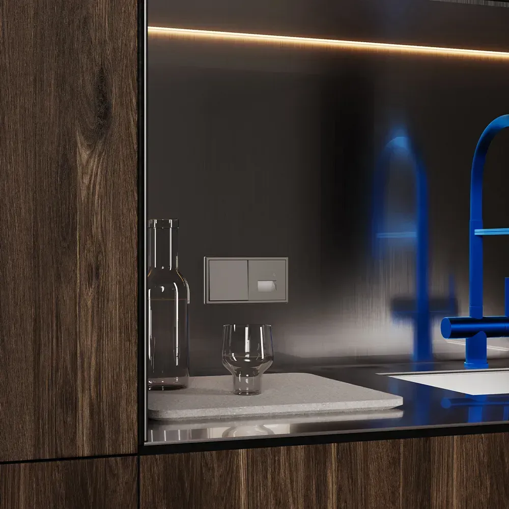 Проходной переключатель полностью совместим с пластиковыми и стеклянными рамками той же серии и гармонично вписывается в любую композицию из розеток, выключателей и умных устройств VOLTUM S70.
